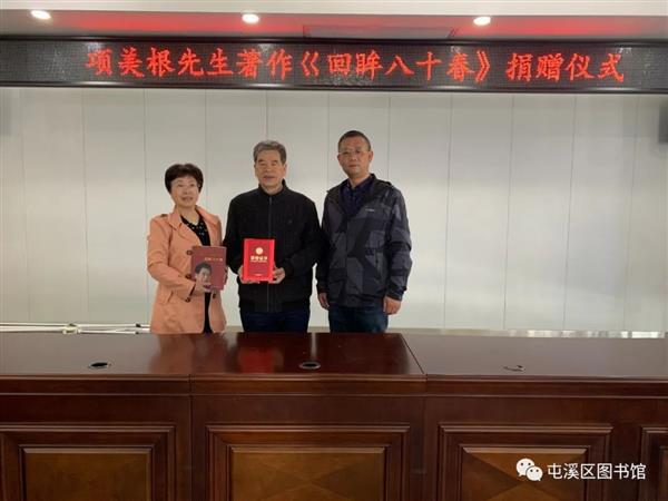 4月26日上午,項美根先生捐書儀式在屯溪區圖書館六樓會議室舉行。項美根先生此次捐贈給我館的是他的個人作品《回眸八十春》。屯溪區圖書館館長胡煒接收了圖書饋贈,副館長王鵬為項老頒發捐書證書。