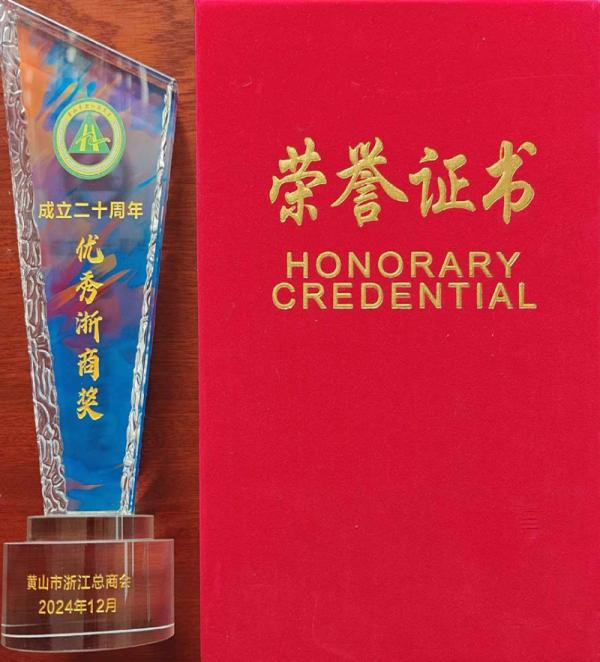 2024年12月18日下午,黃山市浙江商會五屆三次會員代表大會暨成立二十周年慶典,在黃山香茗酒店二樓“云海廳”隆重召開。大會由肖紅霞執行會長主持,審議通過陳富標會長工作報告和胡罡監事會主席財務工作報告,宣貫黃山市浙江商會《關于黃山市浙江總商會成立二十周年表彰優秀浙商通報》(黃浙商字[2024]8號)。“黃山市杰出浙商”(5名)、“黃山市優秀浙商”(20名))”在所表彰的二十位黃山市優秀浙商中,我公司終身名譽董事長項美根先生位列榜首,獲此殊榮。