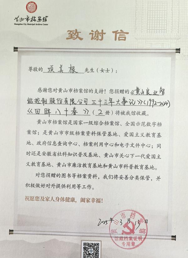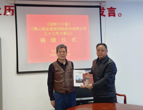 2025年3月13日上午, 公司終身名譽董事長項美根先生以個人名義分別向黃山市檔案館和屯溪區檔案館捐贈圖書《黃山良業智能控制股份有限公司三十三年大事記》(1992-2024)和《回眸八十春》。