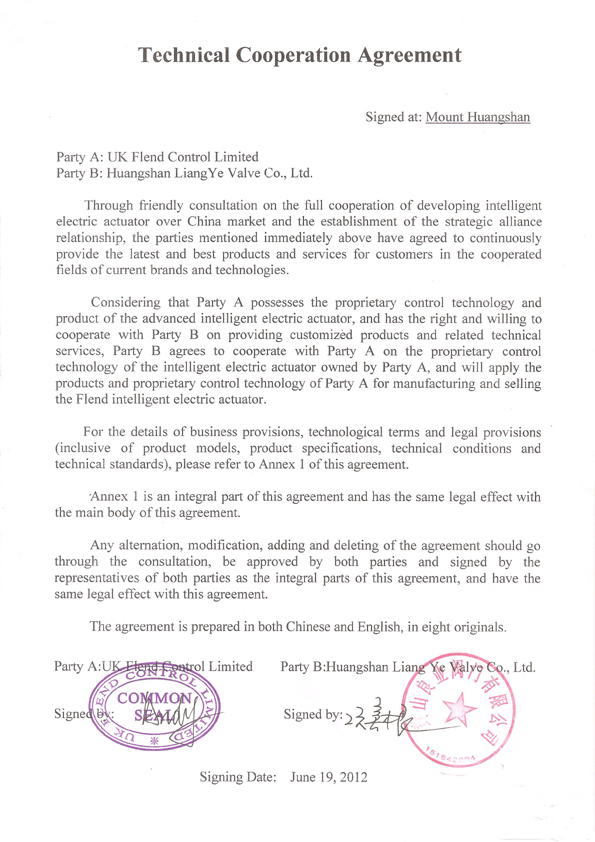 鑒于英國弗蘭德控制公司(UK Flend Control Limited)擁有世界先進水準的智能型電動執行機構專有控制技術及產品,黃山良業閥門有限公司又有良業的電動執行機構研究、開發與制造歷史與記錄。經雙方洽談,黃山良業閥門有限公司和英國弗蘭德控制公司最近正式簽訂了智能型電動執行機構在中國市場的全面合作協議。雙方一致認為在品牌、技術方面,已存在良業的的合作領域。決心繼續為客戶提供最新、最優質的產品和最好的服務。英國弗蘭德控制公司同意對黃山良業閥門有限公司的智能型電動執行機構專有控制技術進行合作,黃山良業閥門有限公司愿意實施英國弗蘭德控制公司的產品及專有技術,制造銷售弗蘭德智能型電動執行機構。此次技術合作,為黃山良業閥門有限公司今后的發展進一步奠定了基礎。